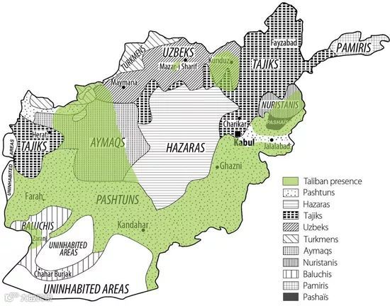 29.塔利班控制区与阿富汗国内民族分布示意图。