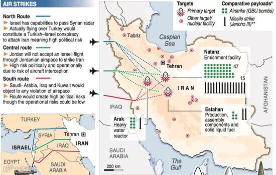 26.伊朗核设施分布以及以色列可能采取的空袭路线示意图