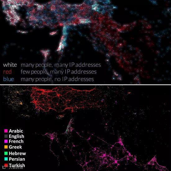 上图反映的是互联网连接IP地址使用状况:白点:人口密集区,IP地址很多;