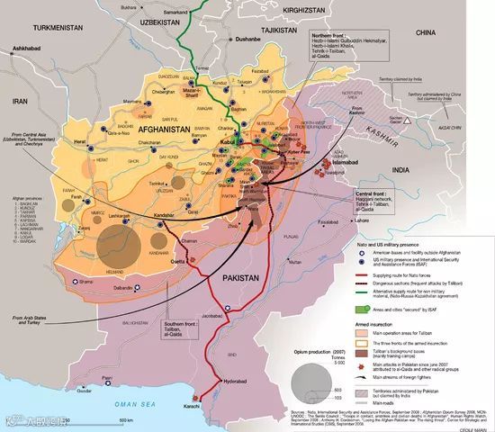 本图展示了美国于2001年发动“反恐战争”以来,阿富汗国内的一些整体情况。
