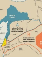《赛克斯-皮科协定》是一战期间,英国与法国于1916年5月16日签订的瓜分奥斯曼帝国亚洲部分的秘密协定。因谈判人英国代表M.赛克斯和法国代表G.皮科而得名。协定包含的内容如下:(1)黎巴嫩和叙利亚西部沿海地区(包括西利西亚),由法国直接占有(图中的蓝色部分);(2)伊拉克中部和南部以及巴勒斯坦的海法和阿克两港,由英国直接占有(图中橙色部分);(3)巴勒斯坦地区由国际共管(图中黄色部分);(4)在叙利亚东部和摩苏尔(图中“A区”,归法国管辖)以及伊拉克北部和外约旦(图中“B区”归英国管辖)建立一个独立的阿拉伯国家或独立的阿拉伯邦联国家。