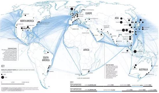 本图为2011年全球海运示意图,从苏伊士运河的位置不难看出其非同寻常的战略意义。