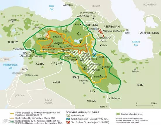 绿线:1945年,旧金山第一届联合国会议上,库尔德代表团提出的建国范围。