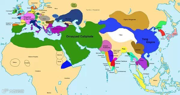这张图展示了公元750年的世界政治版图,此时的阿拉伯帝国处于倭马亚王朝时期,这是阿拉伯伊斯兰帝国的第一个世袭制王朝。在伊斯兰教最初四位哈里发执政结束后,由前叙利亚总督穆阿维叶(即后来的哈里发穆阿维叶一世)所创建。统治时间自公元661年始,至公元750年终。该王朝是穆斯林历史上最强盛的王朝之一。当时能与阿拉伯帝国抗衡的只有位于今天中国境内的大唐王朝。