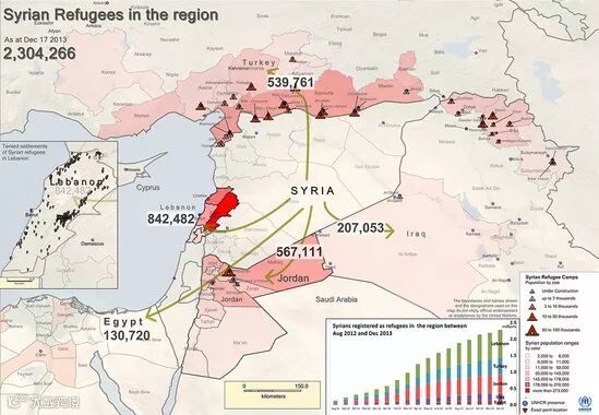 叙利亚内战不仅给本国带来了巨大灾难,对于邻国同样如此,战争造成数百万叙利亚难民逃往欧洲以及中东其他国家。本图展示的内容并不包括后来逃离叙利亚的650万难民,受难民冲击最严重的两个国家分别是约旦和黎巴嫩,此前他们已接收了大批巴勒斯坦难民。