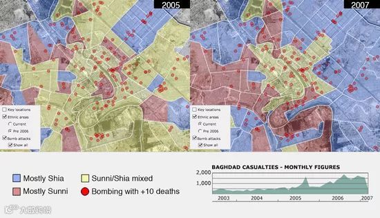 伊拉克战争(注:这里指的是美军2003年入侵伊拉克之后至今的伊拉克动荡局势,并非单指伊拉克战争)期间的种族屠杀问题很少被外界所关注,而2005年以来这一问题呈现愈演愈烈的趋势。英国广播公司对此专门进行了研究,左图为2005年巴格达周边的什叶派和逊尼派居住区分布情况,蓝色部分为什叶派、红色部分为逊尼派,黄色部分则为什叶/逊尼派混住区。红点为超过10人死亡的炸弹袭击事件。右图为2007年拍摄的同一地区的分布情况,可见两派混住区已被压缩到很小的区域,而一些原来为蓝色的区域,已被红色所取代,这都直接反映了当地存在宗教种族清洗事件。这些事件的制造者多为极端势力的行刑队和民兵所为。