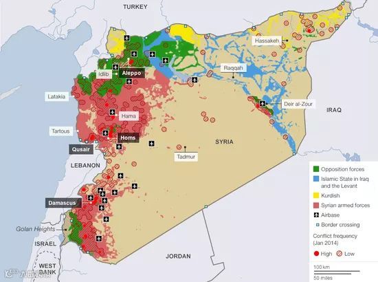 本图展示了2011年叙利亚内战爆发3年之后的各方势力分布图。