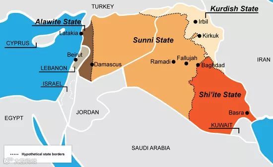 这实际是一个很古老的设想,只是每隔几年,当什叶派和逊尼派冲突激化时,就会有人提出来。这张图将伊拉克和叙利亚的边界重新划分,分成了四大部分,棕色部分为“阿拉维国”(阿拉维派),土黄色部分为“逊尼国”,浅白色为“库尔德国”,红色部分为“什叶国”,黑虚线为假想国境线。