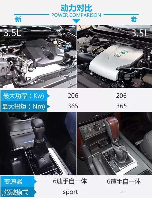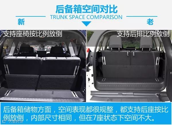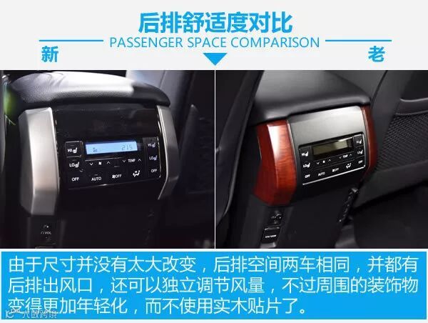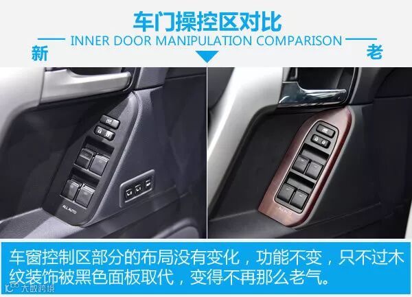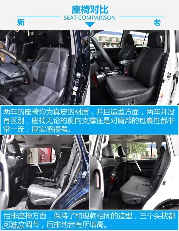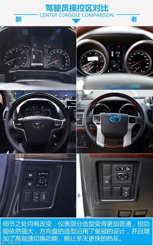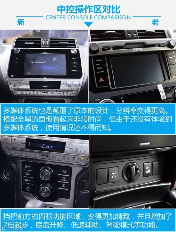 内饰造型的变化还是很大的,所有的地方全部进行了全新的设计,变得更有科技感,银色与黑色的搭配让整车内饰变得更加年轻。细节之处均有改变,仪表部分造型变得更加普通,但功能依然强大,方向盘的造型沿用了皇冠的设计,并且增加了高怠速切换功能,能让冬天更快的热车。四驱也由全时四驱变为了分时四驱,并且加入了多种越野辅助系统。