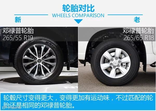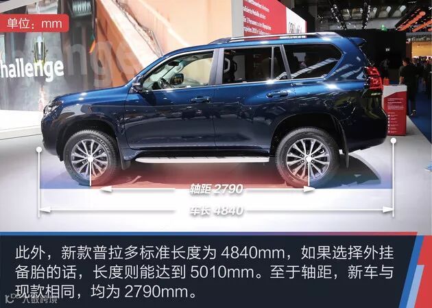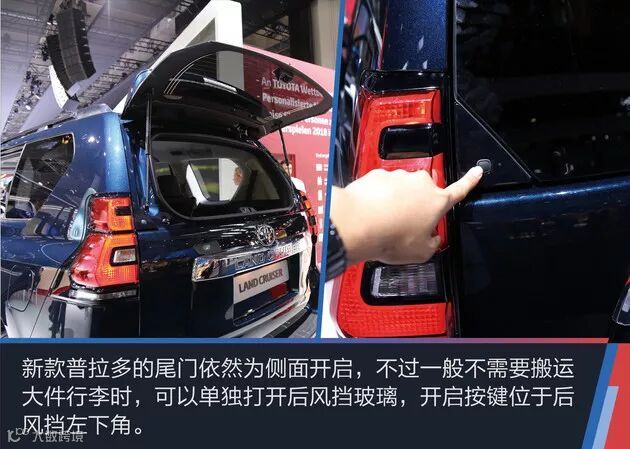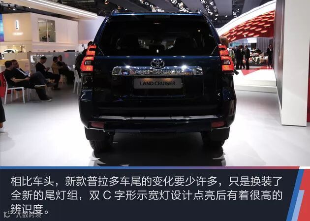 改款后的新普拉多换装了面积更大的粗条状的中网,前保险杠下方的造型更激进,造型变得更加霸气。新普拉多车身轮廓还是和现款一样,颜色也增加了新的蓝色等颜色,轮毂也大了一号。尾部造型的变化主要在于后尾灯的造型,排气管依然为单出设计,并且还有背挂式备胎的版本。