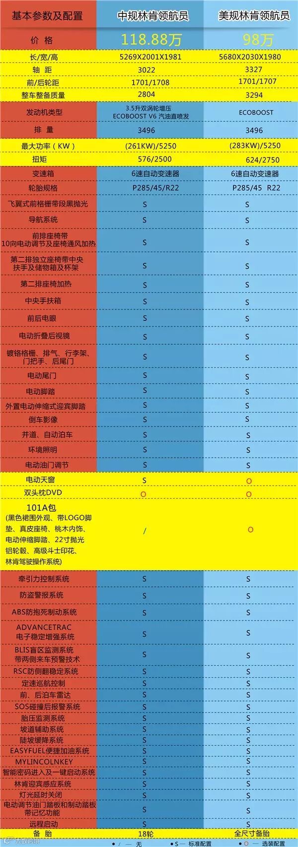 从以上表格我们不难分析:美规LINCOLN NAVIGATORL比中规LINCOLN NAVIGATORL的车身要长,空间要大,在同样都是6速自动变速器的情况下提速更快。
