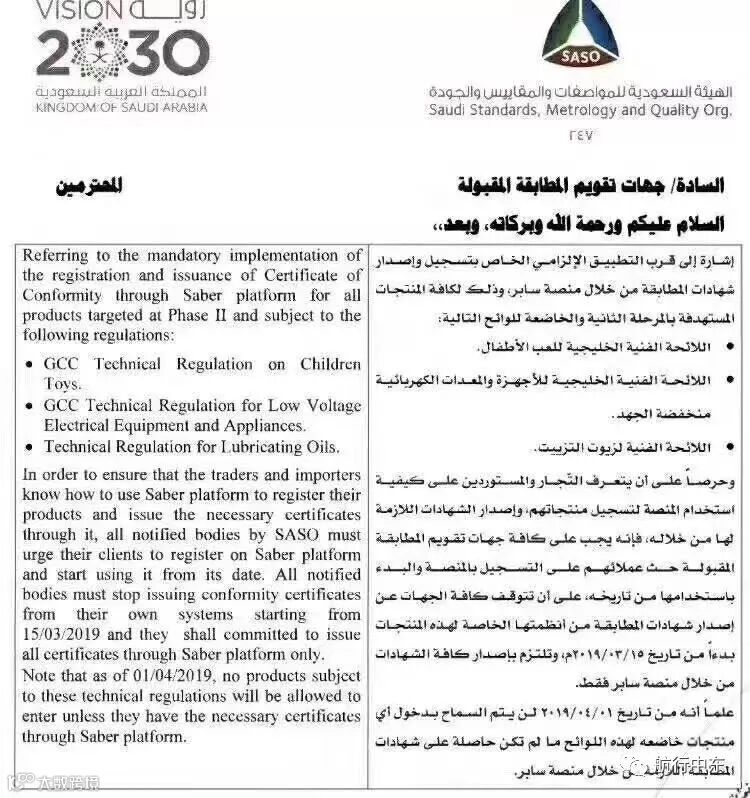 4月一日起沙特·计量局将全面强制进行saso系统改制。
