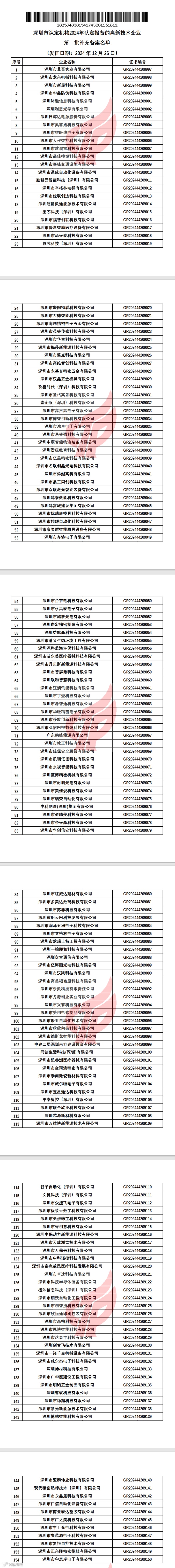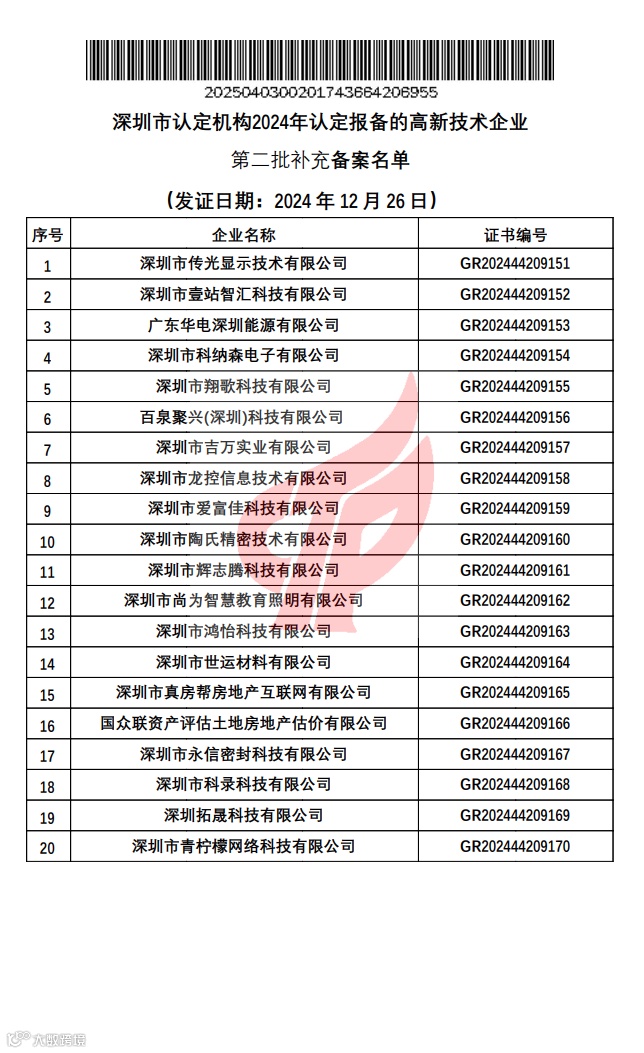 根据《高新技术企业认定管理办法》(国科发火〔2016〕32号)和《高新技术企业认定管理工作指引》(国科发火〔2016〕195号)有关规定,现对深圳市认定机构2024年认定报备的高新技术企业第二批补充备案名单(详见附件)予以公告。