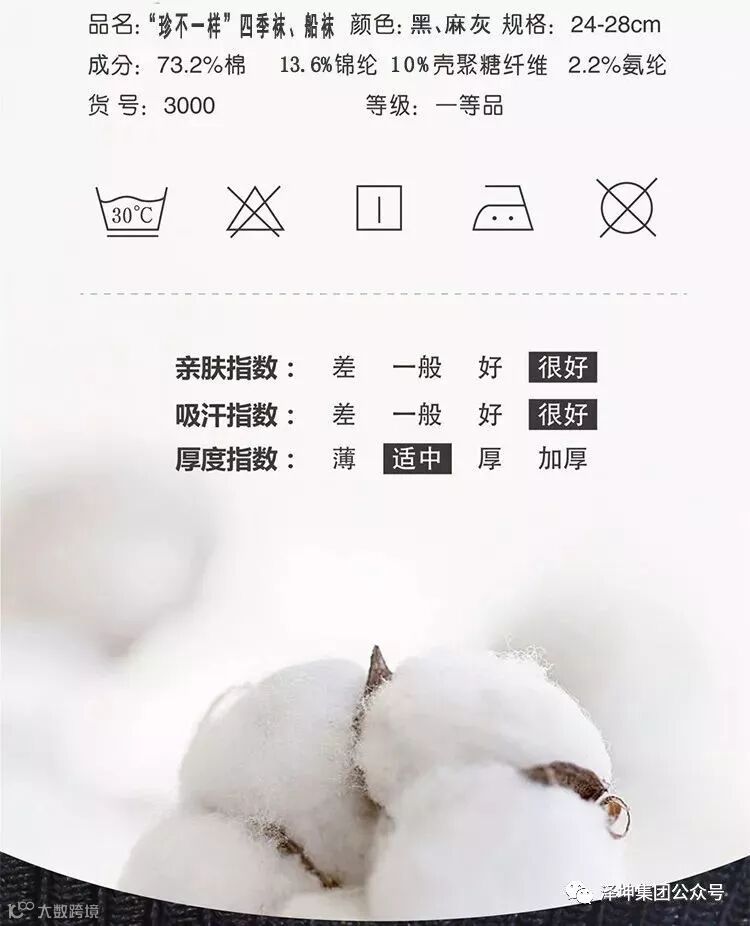 “珍不一样”的壳聚糖纤维抗菌防臭袜,具有超耐水性。采用专利技术的壳聚糖纤维被固定于纺织纤维内部且受到有效的保护。使“珍不一样”壳聚糖纤维抗菌防臭袜,具有耐久的抑菌、防过敏、透气和祛异味的作用和效果。也保证了“珍不一样”壳聚糖纤维抗菌防臭袜的优良水洗牢度。