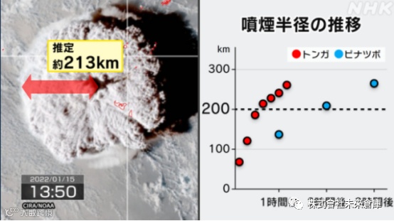皮纳图博火山喷发半径仅在两个小时后就超过了 200 公里,而这次喷发仅用了 40 分钟就达到了 200 公里。仅考虑喷发后的情况,据说喷发到大气中的流入速度大约是皮纳图博的三倍。