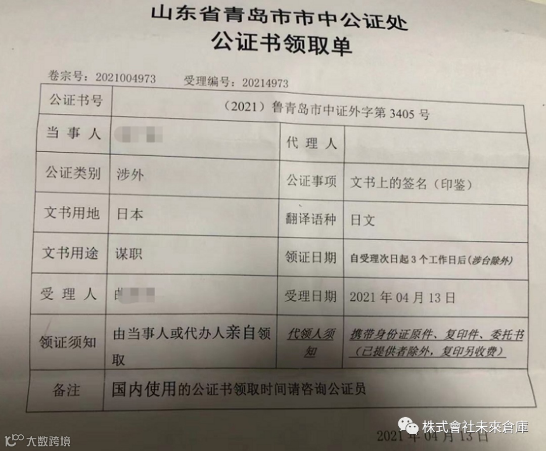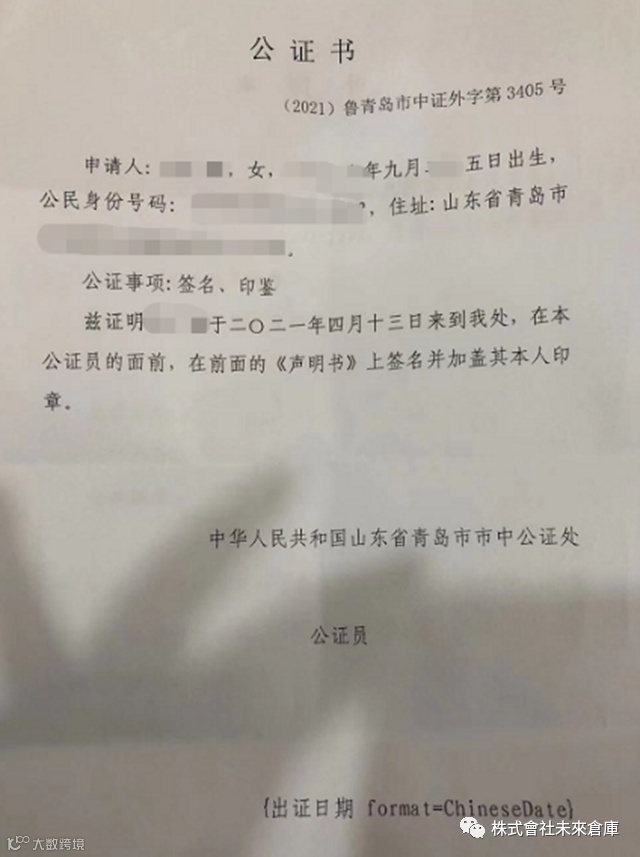 5.公证书可根据需求,在公证处安排带领或者邮寄,青岛地区也可以委托未来仓库日本海外仓代取。