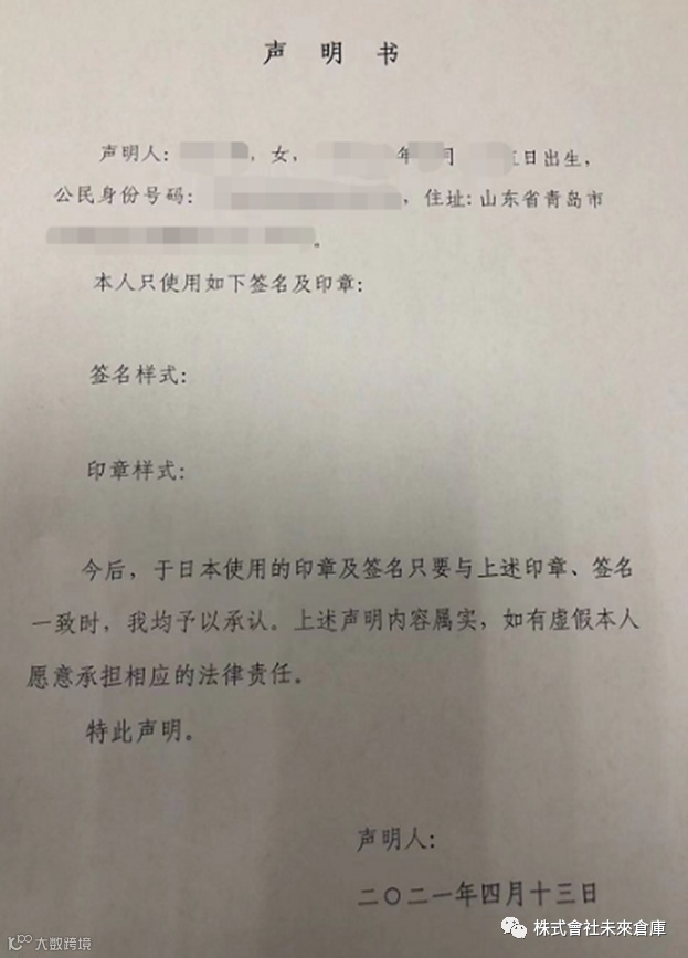 5. 翻译公证书和声明书。(翻译后的样式如下,手下可以节省翻译费,如需原版请联系我们未来仓库日本海外仓)