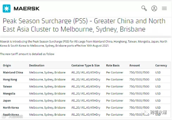 马士基将从2021年8月16日起对从中国大陆、中国香港、中国台湾、蒙古、日本、朝鲜和韩国到墨尔本、悉尼、布里斯班港口的所有货物征收旺季附加费(PSS)。