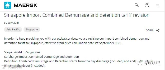 此外,马士基对新加坡进口的综合滞箱费和滞港费进行调整,自2021年9月1日起生效。