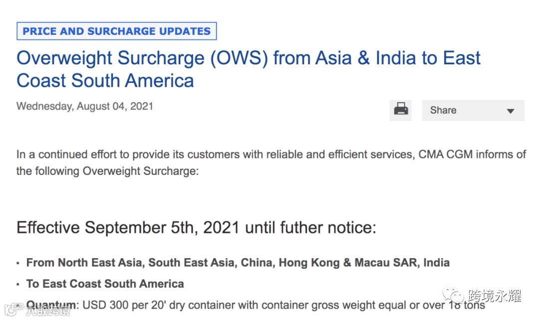 根据公告,上调范围为:每20英尺干箱,集装箱毛重等于或超过18吨的,上调300美元。