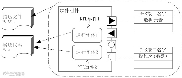 每个软件组件必须提供其代码的具体实现以及描述文件。代码实现即运行实体的实现,以C源文件或者目标文件的方式提供。而描述文件必须描述软件组件的属性,包括所使用的端口、端口接口、运行实体、以及运行实体所对应的RTE事件等,以arxml文件形式提供。综上所述,在AUTOSAR中的软件组件可以用如上图所示的示例图来表示。
