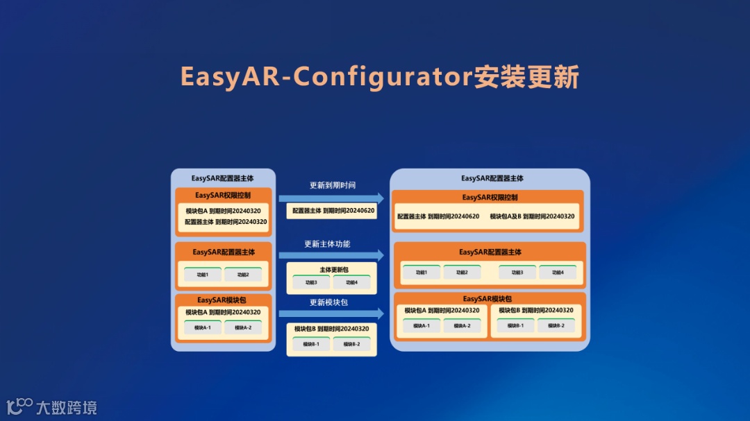 EasySAR-Configurator主体、功能模块包以及两者相应时间等控制可分别独立安装,独立更新,减少彼此依赖,根据模块包权限优先级大于配置器主体优先级,实现即插即用。