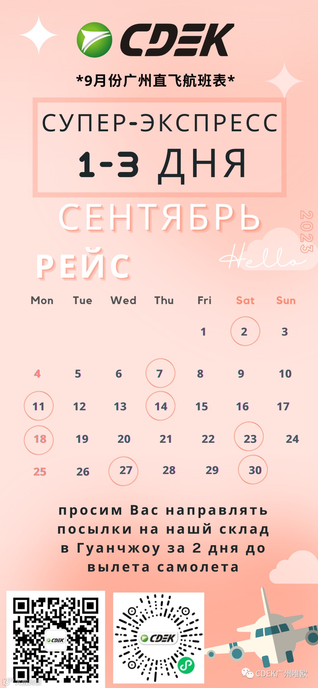 просим Вас направлять посылки на нашй склад в Гуанчжоу за 2 дня до вылета самолета,