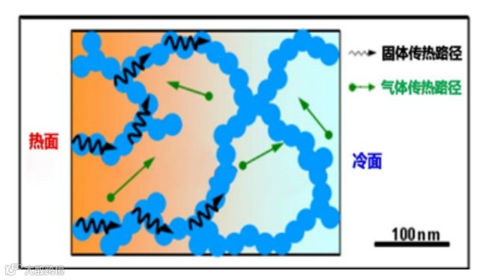 1. 无对流效应:气凝胶纳米材料中的气孔直径小于70nm, 气孔内的空气分子就失去了自由流动的能力,处于近似真空状态,无法进行热对流。