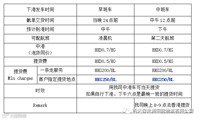 应广大市场客户强烈要求,深圳市百达保运通国际物流有限公司开通中港中班车服务。一条龙广深两地收货,每日两趟港车下港,香港专车接驳提货服务,空运时效再提速!