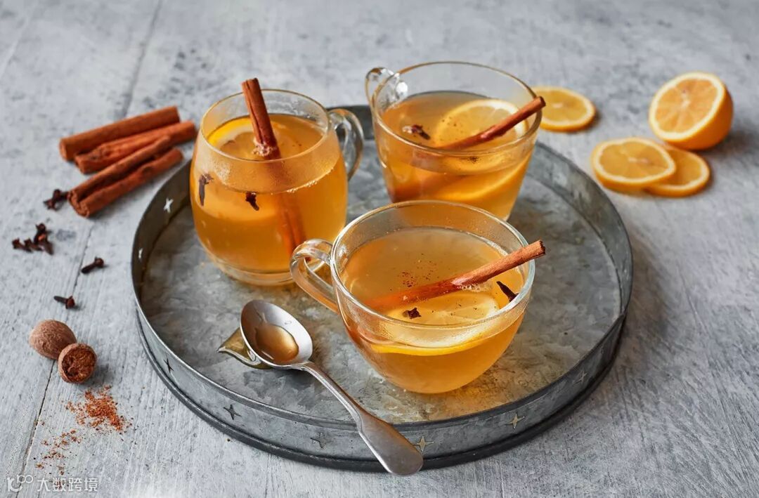 Garnish with a clove-studded orange peel, and a cinnamon stick.