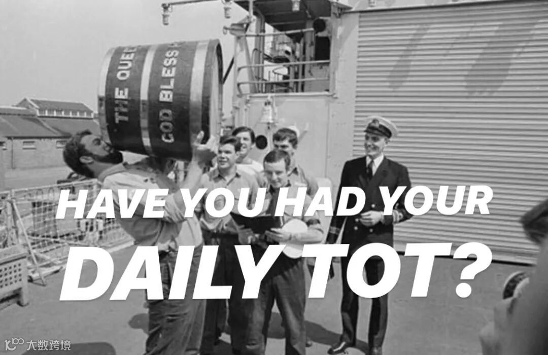 每一天的朗姆酒配给量通常称为“一杯(tot)”,指70ml的朗姆酒(通常会超标),也就是1/8品脱(英国),在正午时候分给船员。渐渐地,分发朗姆酒的过程变成了一种礼仪——“告昭众灵”(Up Spirits)仪式🔮。