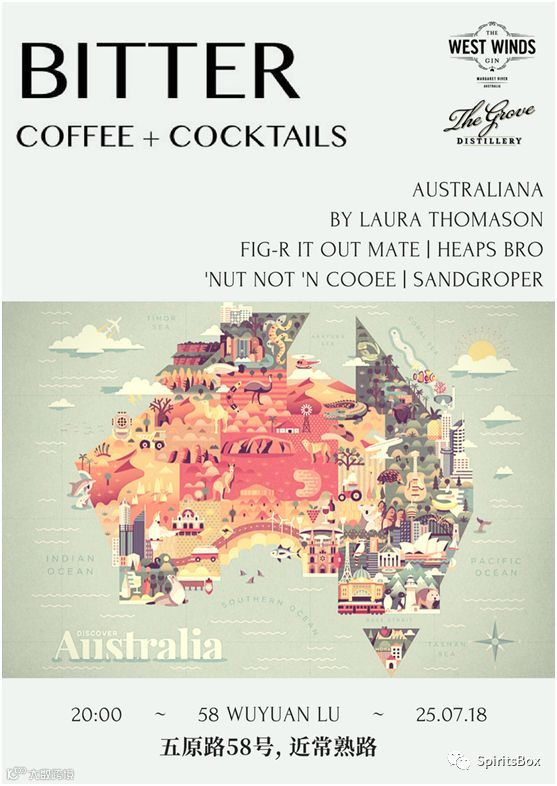 7月25日,Bitter酒吧,晚上八点开始,来和Laura Thomason一起享受#澳大利亚的风味。Laura将用格罗夫朗姆酒和西风金酒(澳大利亚最受赞誉的金酒)给你们调制美味的饮品。