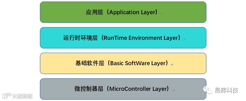 为实现应用程序和硬件模块之间的分离,AUTOSAR架构被抽象成四层,由上至下依次为:应用层(Application Layer)、运行时环境层(Run Time Environment,即RTE)、基础软件层(Basic Software,即BSW),以及微控制器层(Microcontroller)。