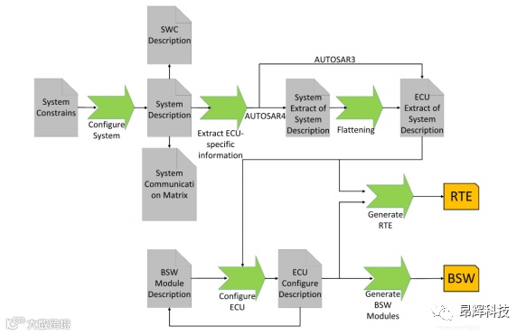 AUTOSAR 为汽车电子软件系统开发过程定义了一套通用的技术方法,即AUTOSAR方法论。该方法描述了从系统底层配置到 ECU 可执行代码产生过程的设计步骤。