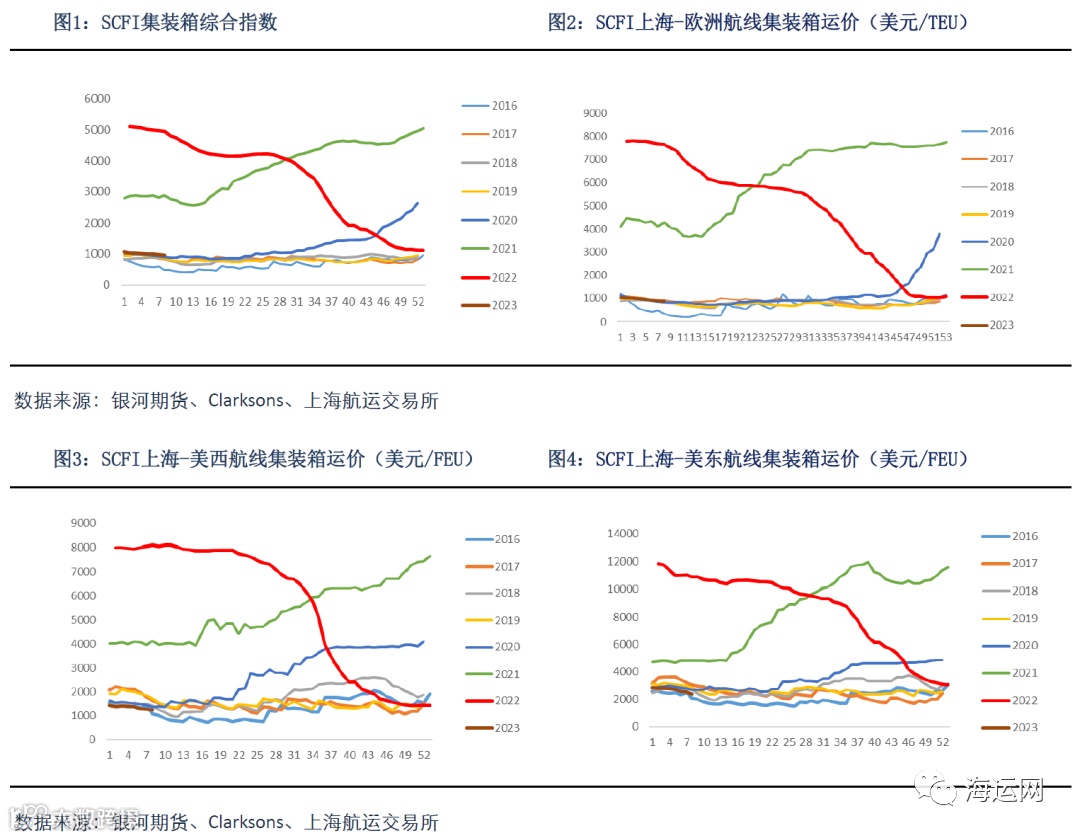 运价方面:2月集装箱运价延续下跌,节后淡季集装箱运输市场供需格局继续走弱。具体来看,截至2月24日当周,上海出口集装箱运价指数SCFI报946.68点,环比-2.9%,同比-80.4%。其中上海-美西线运价报1234美元/FEU,环比-3.1%,同比-84.7%;上海-欧洲航线运价报882美元/TEU,环比-3.1%,同比-88.3%。整体来看,春节过后集装箱航运市场表现平淡,集装箱运输供需格局延续宽松。(查看文章:运价继续下滑!船公司尽其所能......)