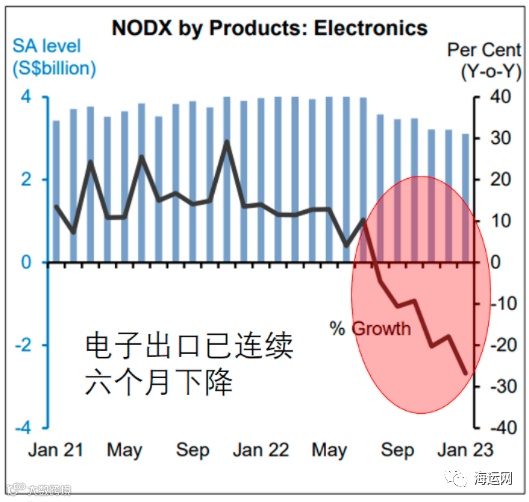 香港最大的竞争对手——新加坡,其外贸情况怎么样呢?2023年1月份,新加坡关键的非石油国内出口(NODX)同比大跌25%,创2013年以来最大单月跌幅,跌幅大于市场预期,连续两个月跌幅超过20%,并且连续四个月下降。
