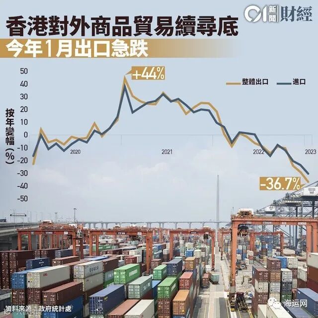 受到全球需求疲软及农历春节假期双重影响,香港2023年1月出口比去年同期下跌36.7%至2909亿港元,创下1953年9月以来即70年来最大跌幅。