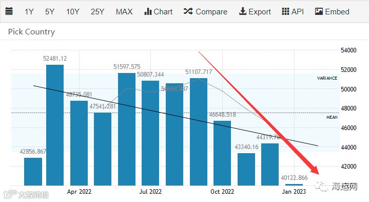 据研究机构Markit公布的数据显示,美国2月制造业PMI初值47.8,虽然较前值小幅上升,但已连续多月处于荣枯线以下。由于通胀继续处于较高水平,美联储将继续加息以遏制通胀,经济增长缺乏足够的宽松政策的支持。美国的进口数据,在2022年3月份创新高,随后在7、8月下滑,在11月份经历一次大幅下滑。