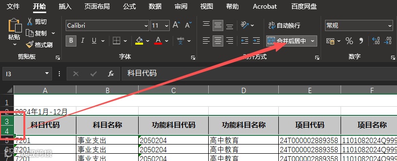 选中第 3 行和第 4 行,取消单元格合并,使表头结构保持统一。这样可以避免在筛选或生成透视表时出现字段识别错误。