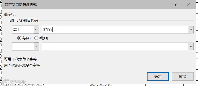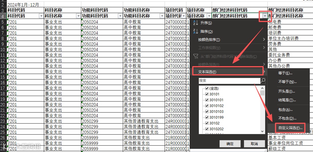 对第 4 行设置筛选功能。点击“数据”选项卡中的“筛选”按钮后,选择文本筛选 → 自定义筛选,在弹出的对话框中输入条件3????。此操作的目的,是筛选出所有部门经济分类为二级科目的数据记录。通过这样的自定义筛选,我们可以更精确地控制数据范围,仅保留需要纳入决算汇总的部分。