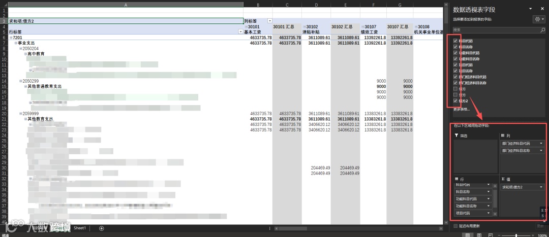 在数据透视表字段设置区域,根据报表展示需求,将相关字段拖入对应的功能栏。例如,将部门名称拖入“行”区域,将经济分类或科目名称拖入“列”区域,将金额字段拖入“值”区域。