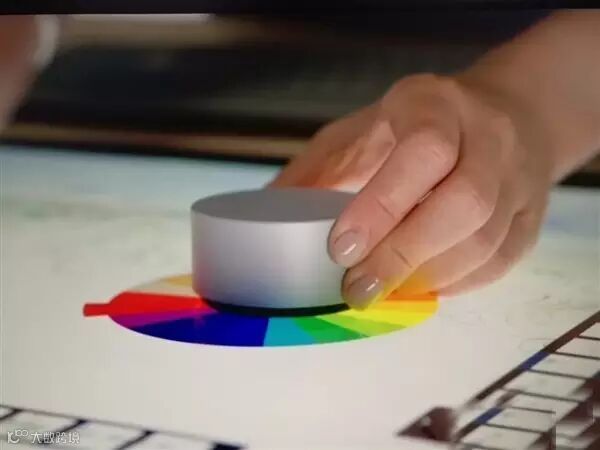 圆形的触控设备——Surface Dial,它是一种全新的输入方式。当手指旋转时可以快进或回退操作动作,Word翻页;而在绘画工作室进行创作时Surface Dial可以进行一些放大缩小,填色取色等功能。