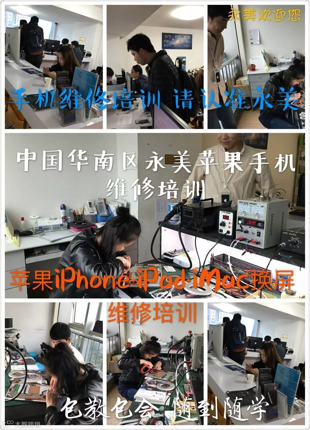 本公司优势:拥有自己的维修团队,研发团队,和华强北有名的远望、飞扬时代300多家维修档口有紧密合作,技术交流,不断更新,技术时刻保持先进,学员工作有保障。拥有十多年维修经验的大师傅手把手教学,保证学员个个都能快速学到最精湛的技术!承接全国维修单,学员有客户机练习。拥有自家完整维修工具器材、配件、主板、二手手机、全新机,为开店的学员提供一手进货货源、高质量的配件和终身免费的技术支持!建设一个完善的维修、配件和货源生态体系。奉承精益求精,不掺杂,专业精通苹果手机维修技术。公司会赠送一套完整的价值3000块钱的维修绝技资料给每一位学员!工具物料全部免费提供给学员,中途不再收任何费用!