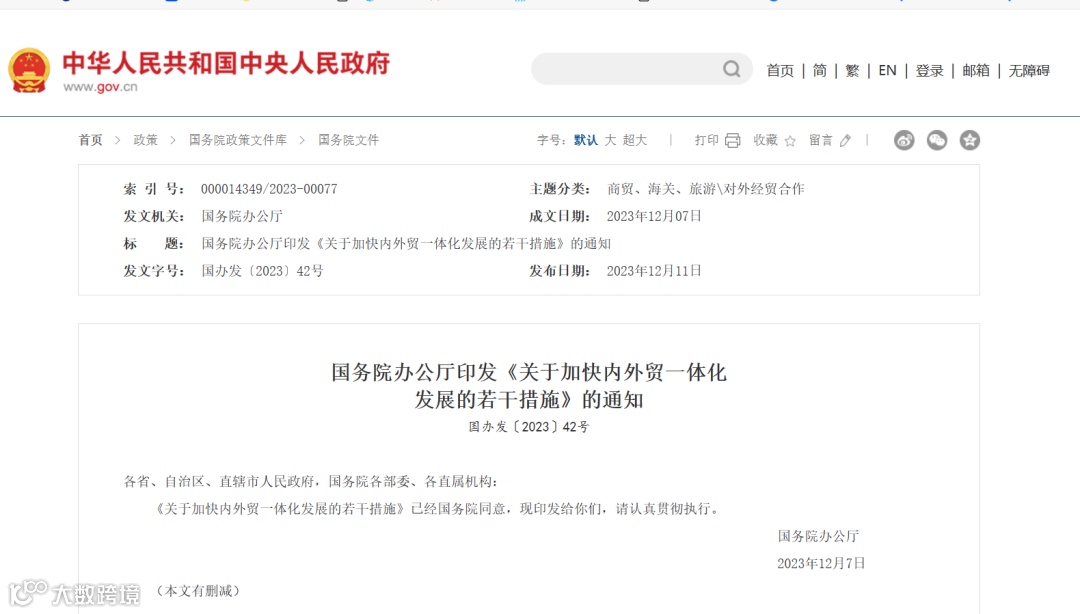 12月11日,为贯彻落实党中央、国务院决策部署,加快内外贸一体化发展,国务院办公厅日前印发《关于加快内外贸一体化发展的若干措施》。