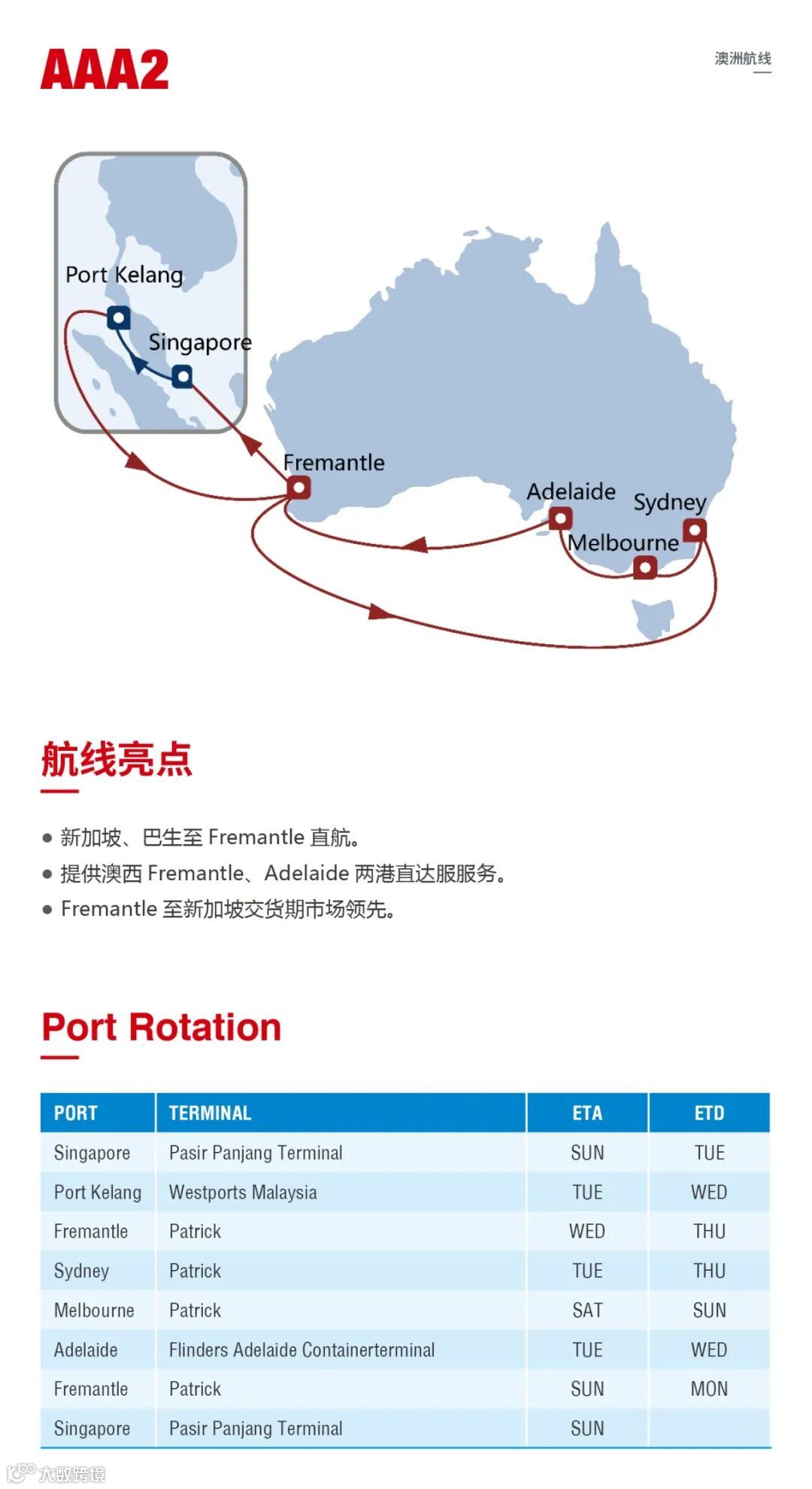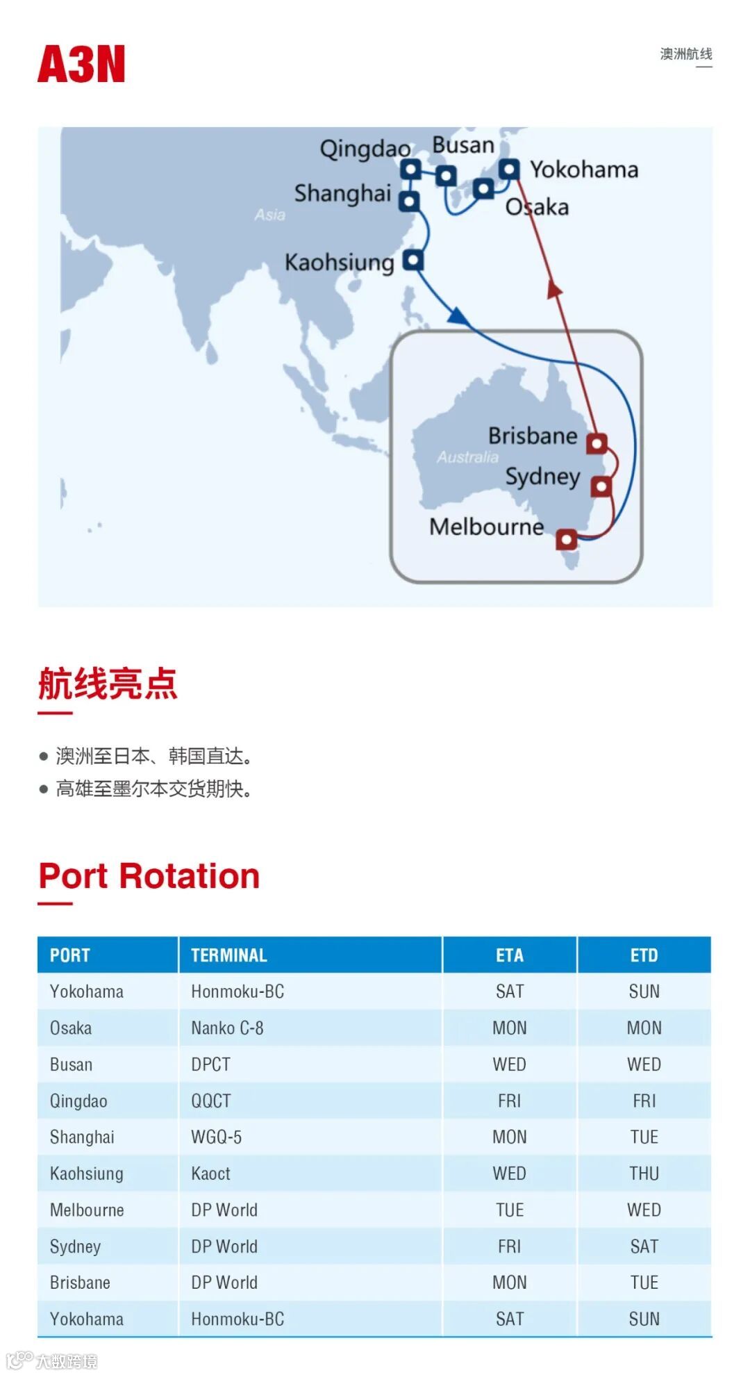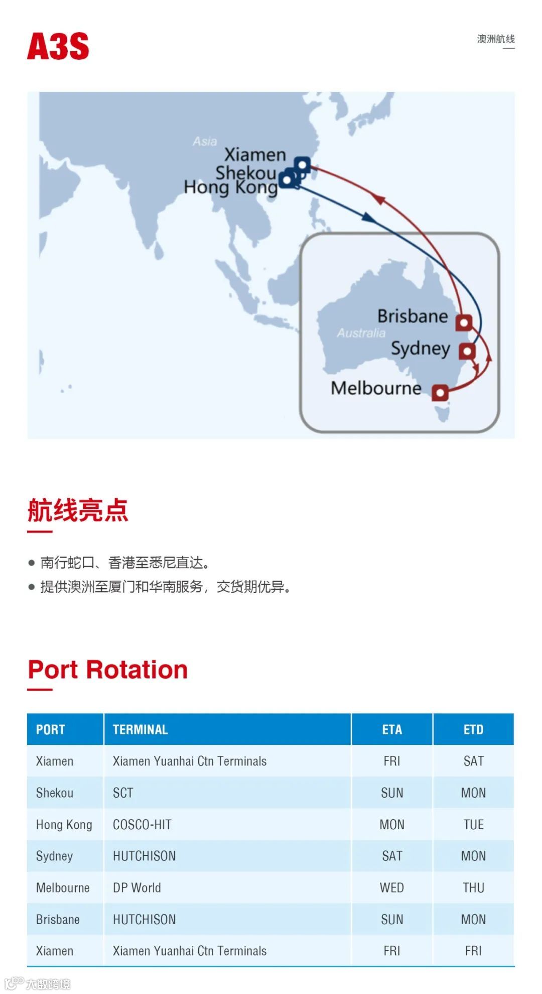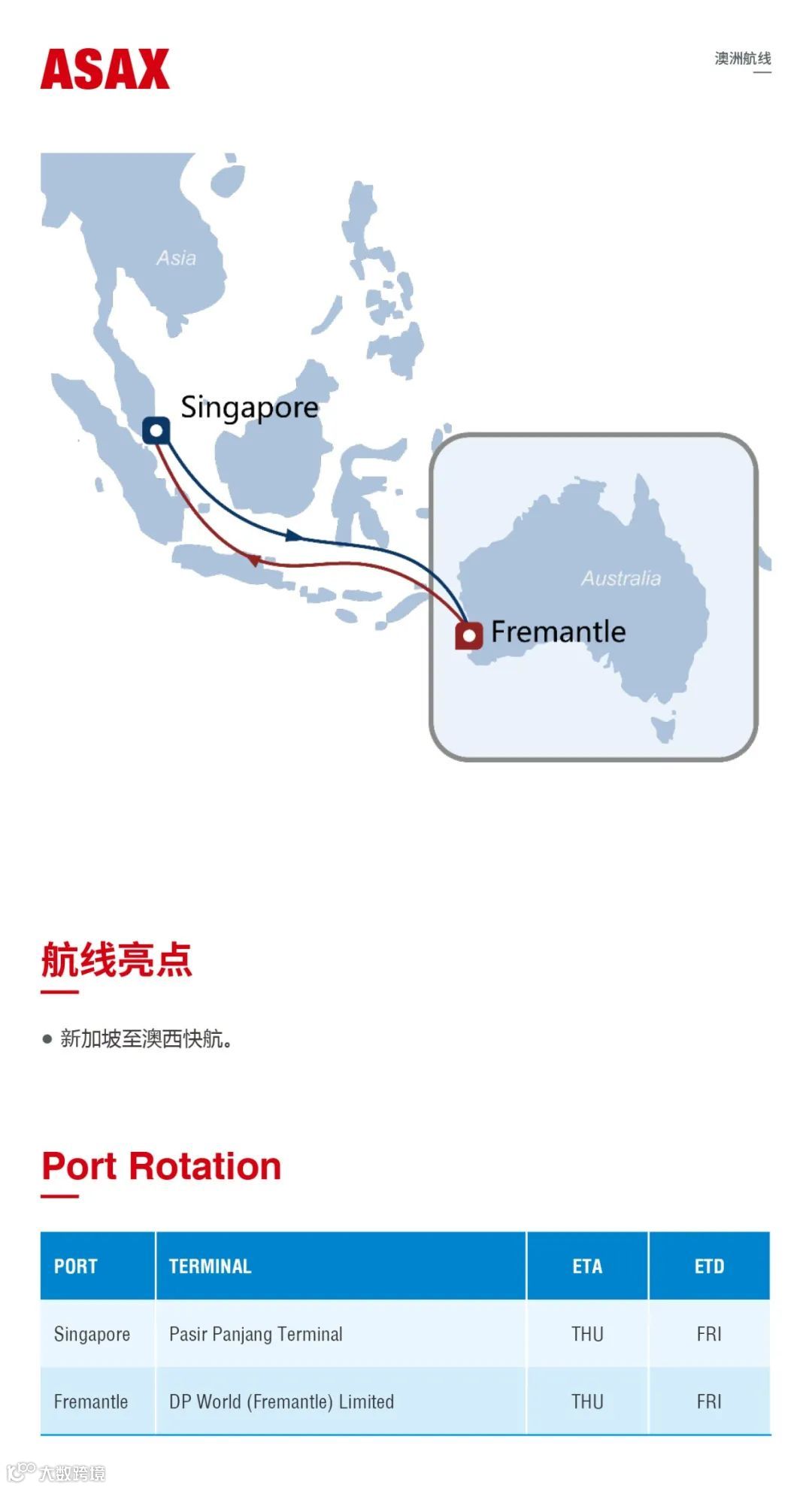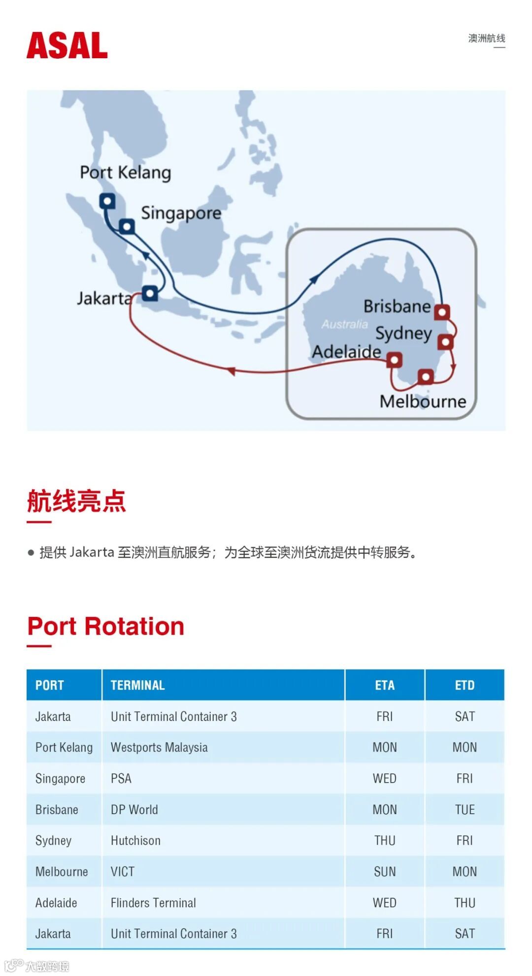 2023年东南亚澳洲ASAL航线再度升级,我司增投一条4250 TEU的自有船,周舱位增加约600 TEU,进一步提升服务能力。