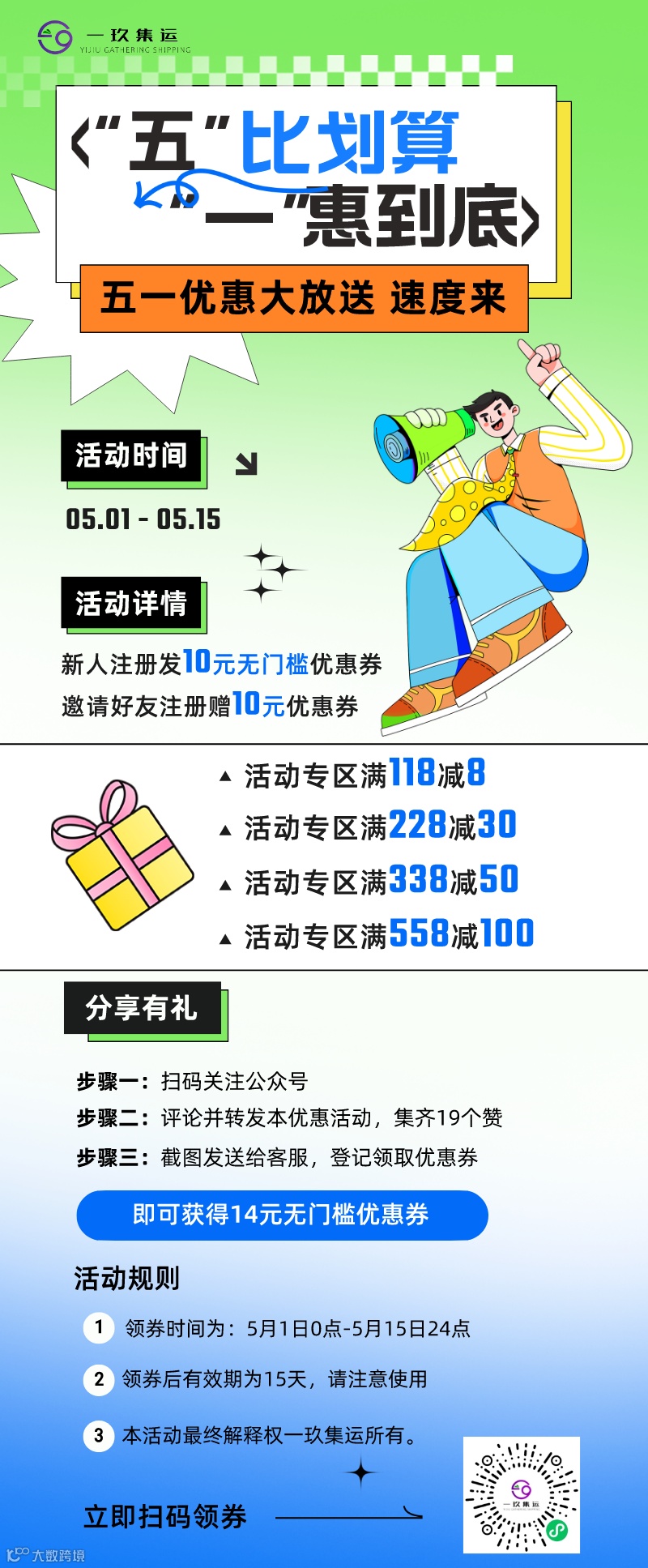 五一钜惠,多寄多优惠!满减多多!新人券、邀新券随手领。这场五一约惠之旅,小玖还为您安排了一场集赞领券活动!