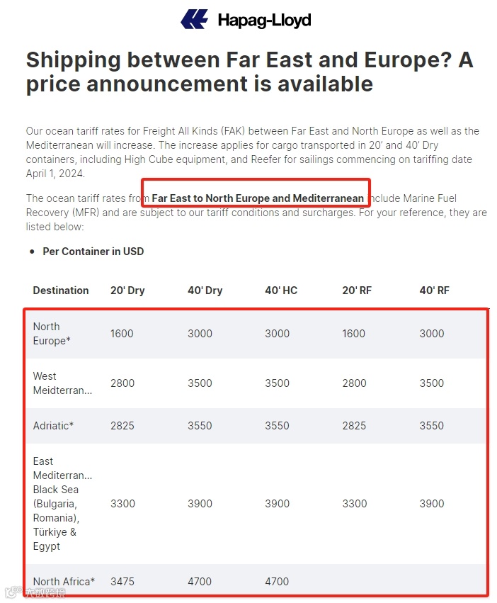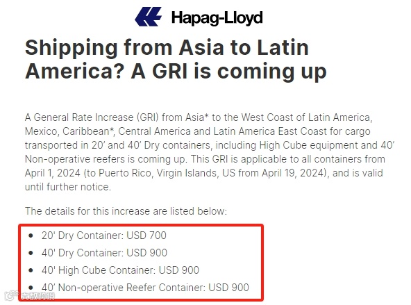 赫伯罗特则宣布对从亚洲至拉丁美洲西海岸、墨西哥等地区的运输实行新的GRI费率。该费率适用于20英尺和40英尺干箱(包括高箱和40英尺非干箱)的货物,自2024年4月1日起生效,直至另行通知。