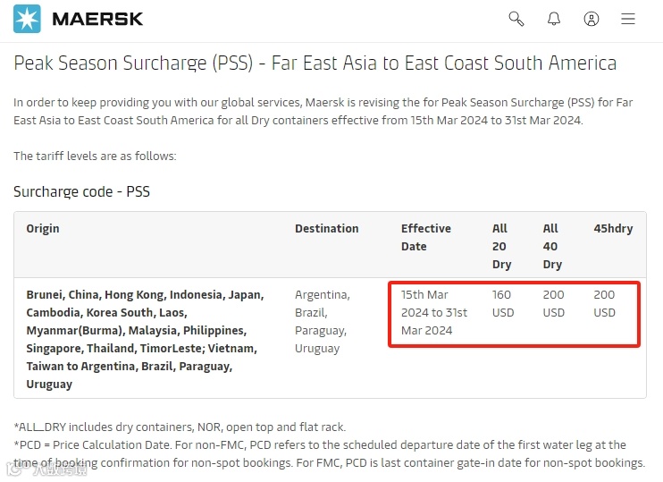 日前,马士基发布公告称,自2024年3月15日至3月31日期间,将对远东至南美东海岸的干集装箱征收旺季附加费(PSS)。具体收费标准为小柜160美元,大柜200美元。这一附加费适用于从文莱、中国、中国香港等亚洲多个国家和地区出口至阿根廷、巴西等南美国家的货物。