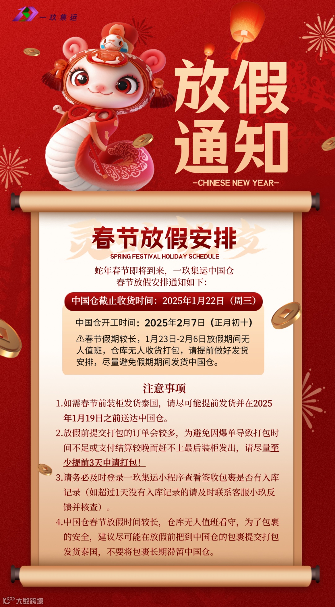 另,我司2025年1月12日(周日)举行公司年会,中国仓将休息一天,仓库无人值班,不收货,不打包。不便之处敬请见谅!
