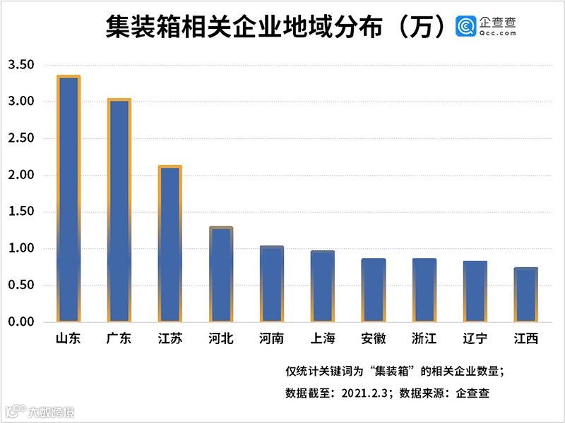 2月3日,企查查数据显示,目前我国共有集装箱相关企业20.51万家,2020年新注册企业4.59万家,同比增长40%。从地区分布来看,山东省以3.35万家企业排名第一,广东、江苏紧随其后,深圳、广州、青岛则是排名前三的城市。(企查查)